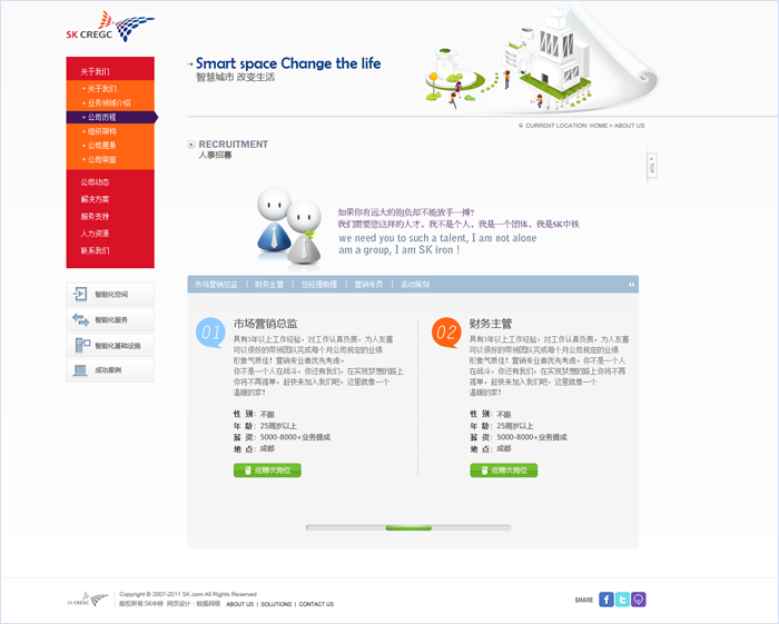 SK中鐵(空間)智能化管理有限公司成立于2010年9月1日,是由韓國SK電訊與中鐵二局共同投資7750萬元人民幣在成都成立的合資公司。智能公司官網(wǎng)由網(wǎng)頁設(shè)計、成都網(wǎng)站制作公司四川銳狐開發(fā)。